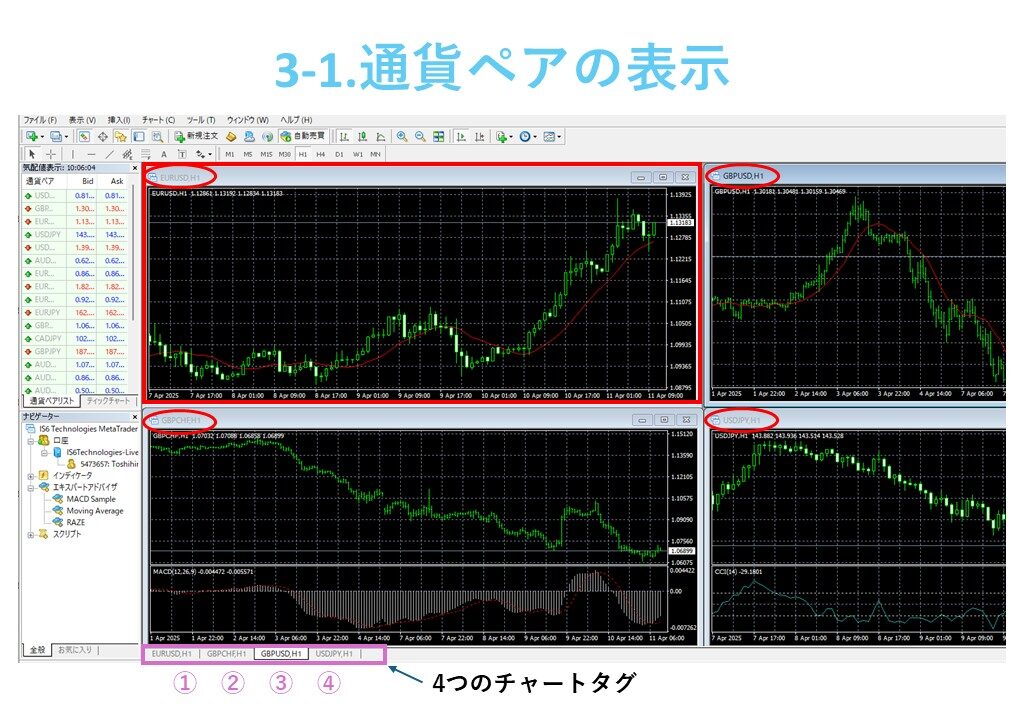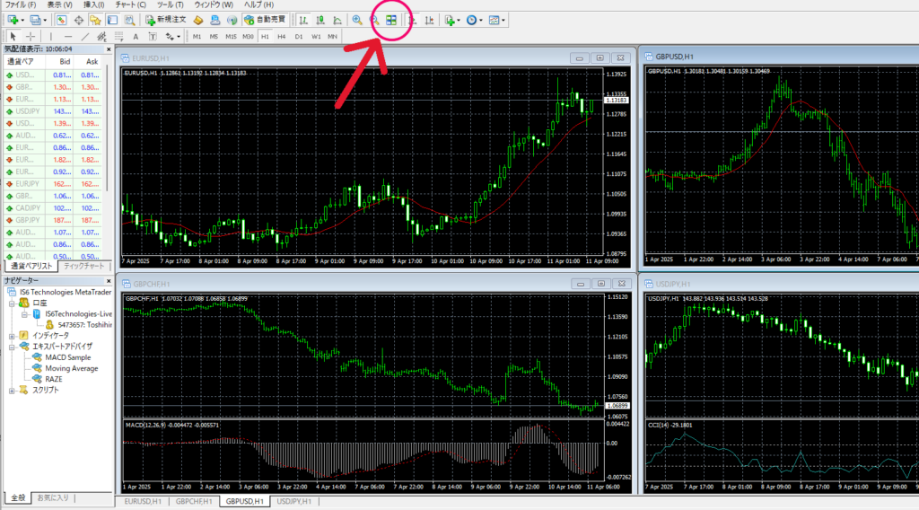 4つの画面が並んでいるようなアイコンをクリックし、チャートを整列させましょう