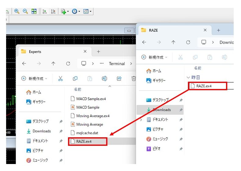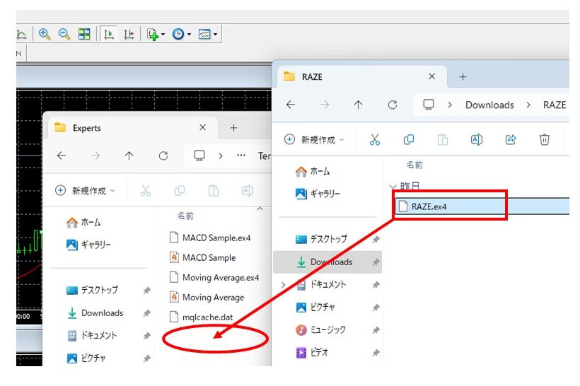 RAZEフォルダー内の「RAZE.ex4」をExpertsフォルダーに移動貼り付け