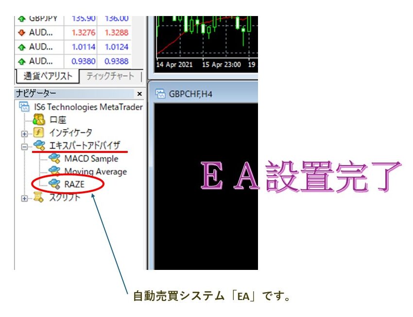 再起動後ナビゲータのエキスパートアドバイザのところに「RAZE」が