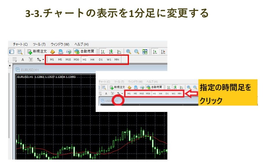チャートをクリックし、「M1」を押下(1分足の表示)