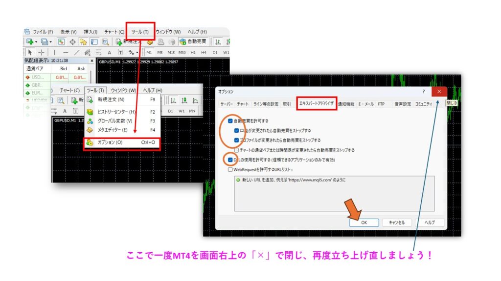 MT4のアプリケーションは稼働したまま(画面はとじない状態)でお願いいたします。